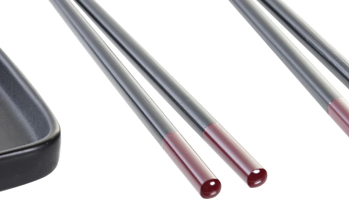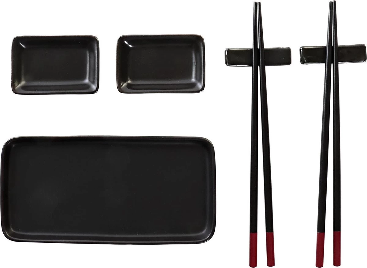 7-delige sushi serveer set aardewerk voor 2 personen zwart. Deze servies set voor sushi bestaat uit 1x rechthoekig bord, 2x rechthoekig schaaltje, 2x paar bamboe eetstokjes en 2x houders voor eetstokjes. Niet geschikt voor de vaatwasser. Afmeting bord: ca. 24 x 10 cm.