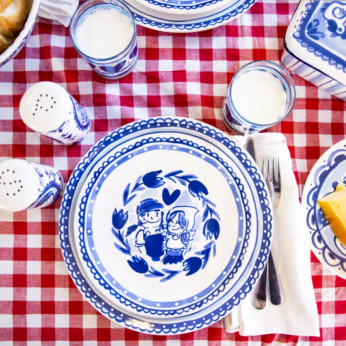 Ontbijtbord in de collectie Delfts Blond. Gekenmerkt door blauwe randen en midden op het bord illustraties van een stel en tulpen. Het ontbijtbord combineer je prima met de andere artikelen uit de Delfst Blondcollectie.