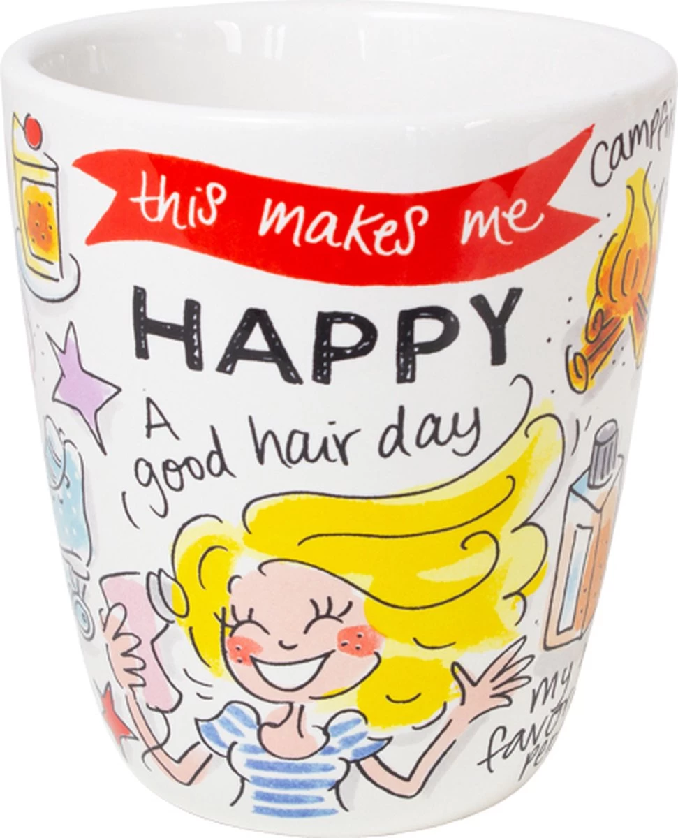 This make me happy! Deze vrolijke beker, maakt jouw tafel nog gezelliger! De opvallende en kleurrijke illustraties zijn in het thema Happy ontworpen. Op de beker staan allemaal grappige quotes die jou blij maken. Zoals a good hair day, the jackpot en ginger cookies. De beker is leuk te combineren met de andere nieuwe Happy items.
