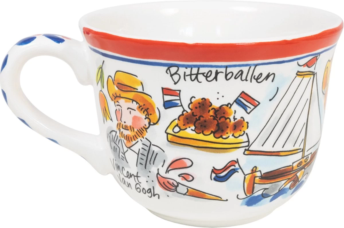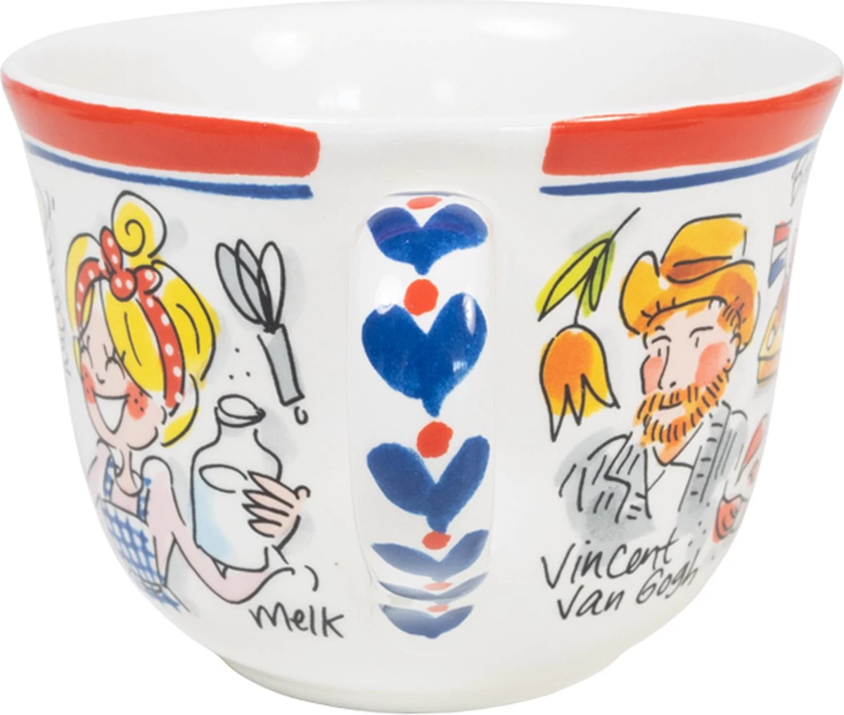 We love Holland! De nieuwe Hollands Glorie lijn van Blond Amsterdam is vormgegeven in frisse rood/wit/blauwe tinten en voorzien van typisch Hollandse illustraties.Op deze soepkom staan o.a. illustraties van Vincent van Gogh, pannenkoeken en klompen.