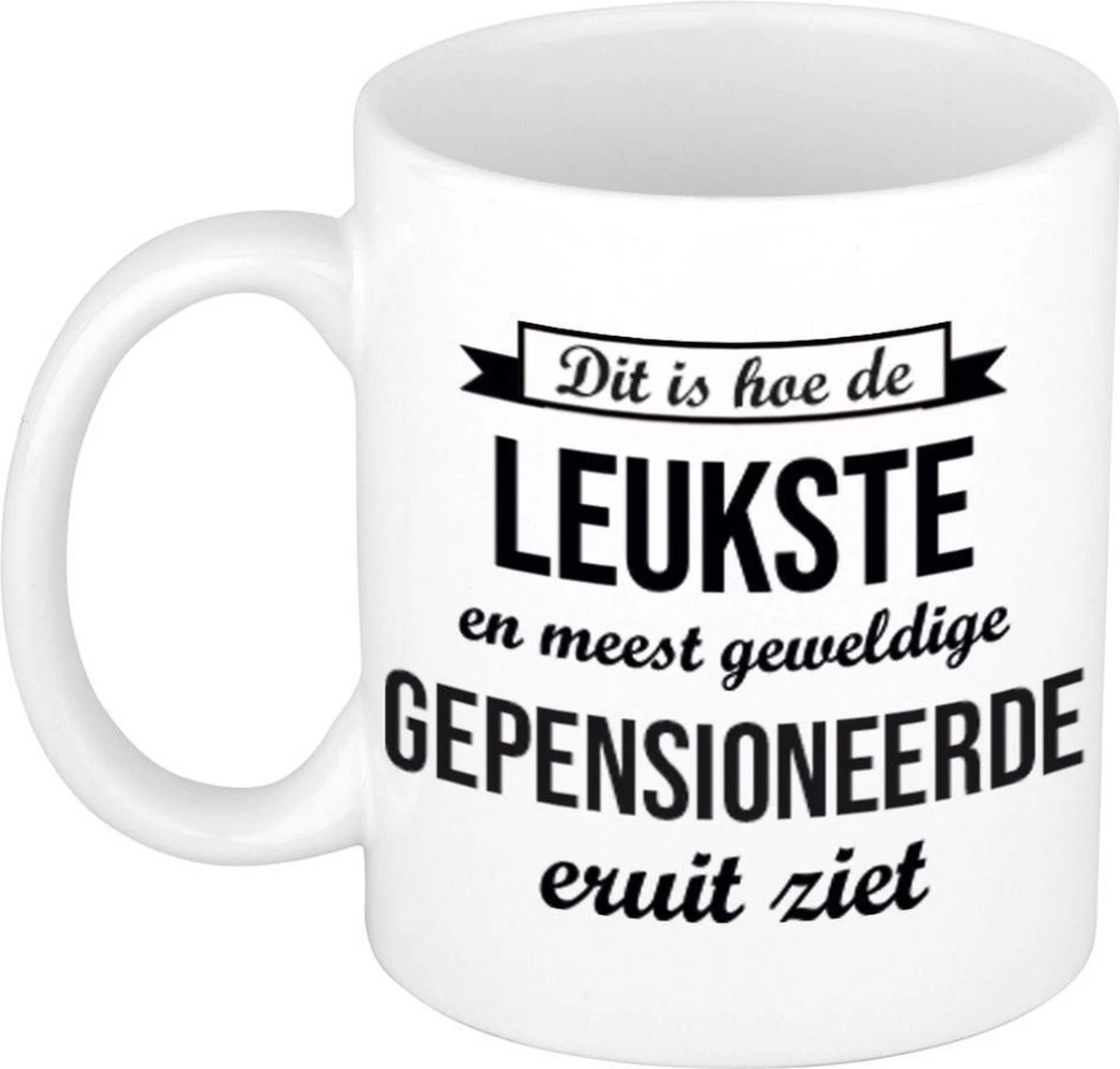 Hoe de leukste gepensioneerde eruitziet mok / beker, 300 ml. De witte beker met de tekst: Dit is hoe de leukste en meest geweldige gepensioneerde eruitziet, heeft een inhoud van ca. 300 ml en is magnetron en vaatwasser bestendig. Leuke mok om cadeau te geven aan een collega die met pensioen gaat! Materiaal: keramiek. Hoogte: 9.5 cm. Doorsnede: 8.2 cm. Kleur: wit – zwart. Bedankt cadeau mok / beker voor VUT / pensioen / gepensioneerde