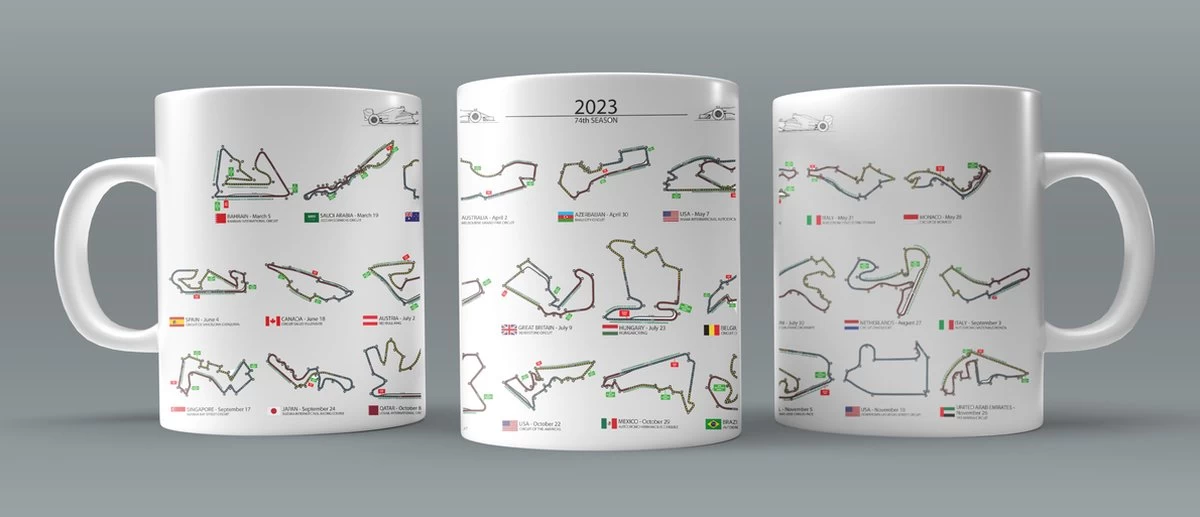 Mis geen enkele wedstrijd meer met deze unieke Formule 1 kalender mok!