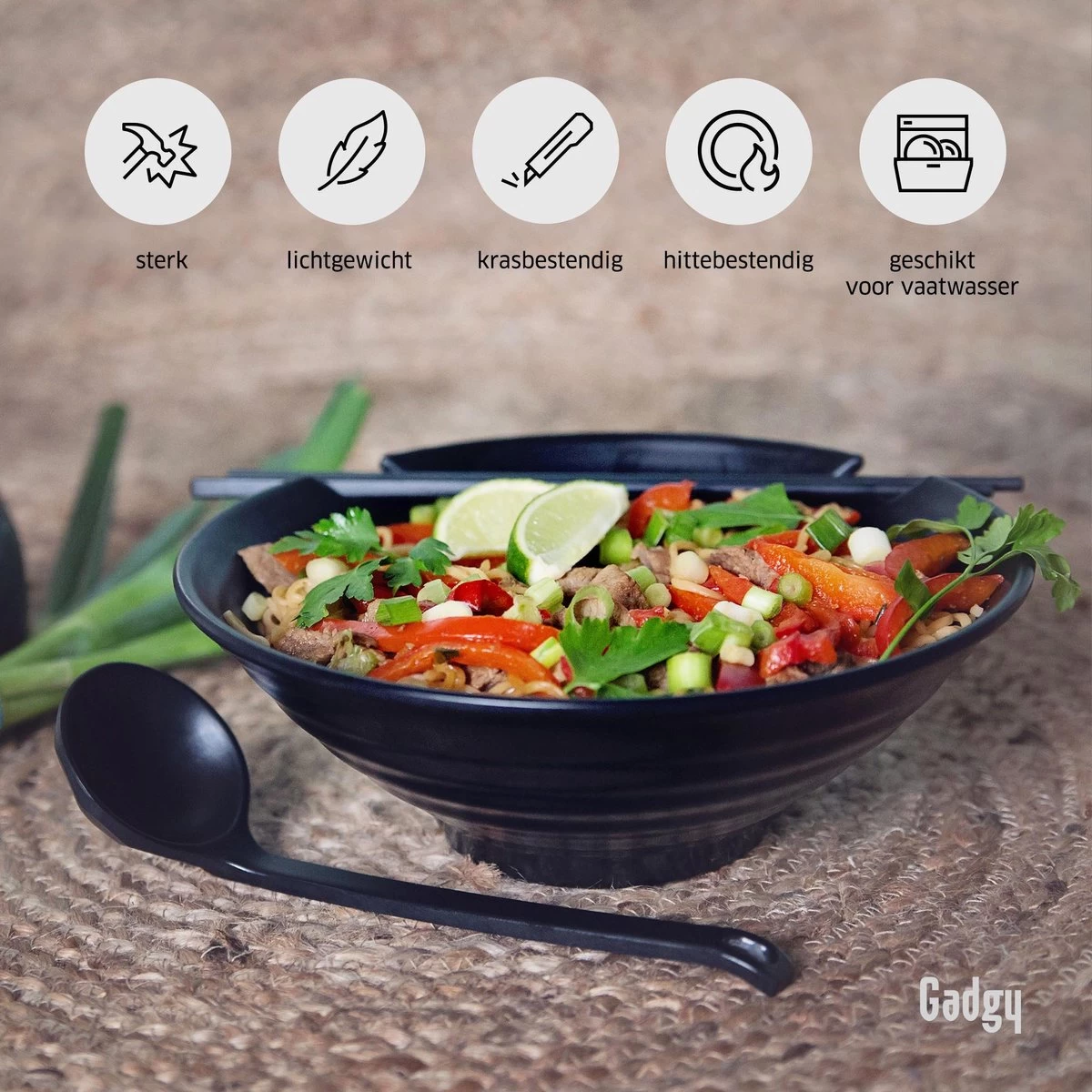 Waan je in Oosterse sferen met je eigenbereide Aziatische gerechten in deze noedelkom set. Deze set bestaat uit 2 kommen, 2 lepels en 2 paar chopsticks. Alles wat je nodig hebt om te genieten van een heerlijke maaltijd voor 2 personen. De set is ideaal voor noedels, noedelsoep, ramen, laksa, poké bowls, curry’s of al jouw andere favoriete recepten.