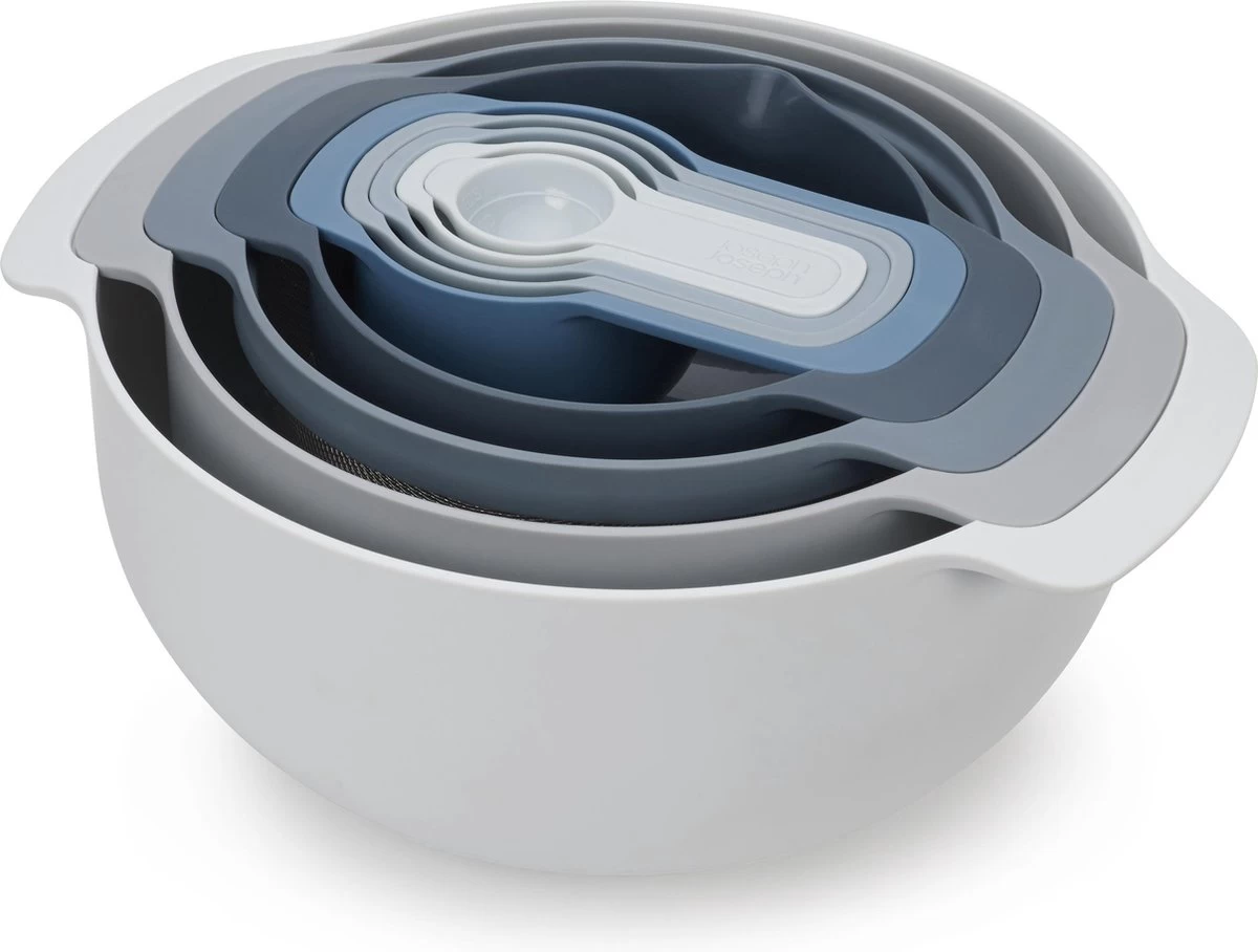 Deze Nest 9 Plus voedselbereidingsset van Joseph Joseph uit de Editions Sky collectie is een echte aanwinst voor in je keuken! De set bestaat uit twee schalen, een zeef, een vergiet en vijf maatlepels. De kleinste schaal is voorzien van een schenktuit. Na gebruik kunnen deze handige keukenhulpjes de vaatwasser in. Nog een groot voordeel is dat ze perfect in elkaar passen. Hierdoor zijn de schalen en maatlepels eenvoudig op te bergen en nemen ze weinig ruimte in beslag in je keukenkast.