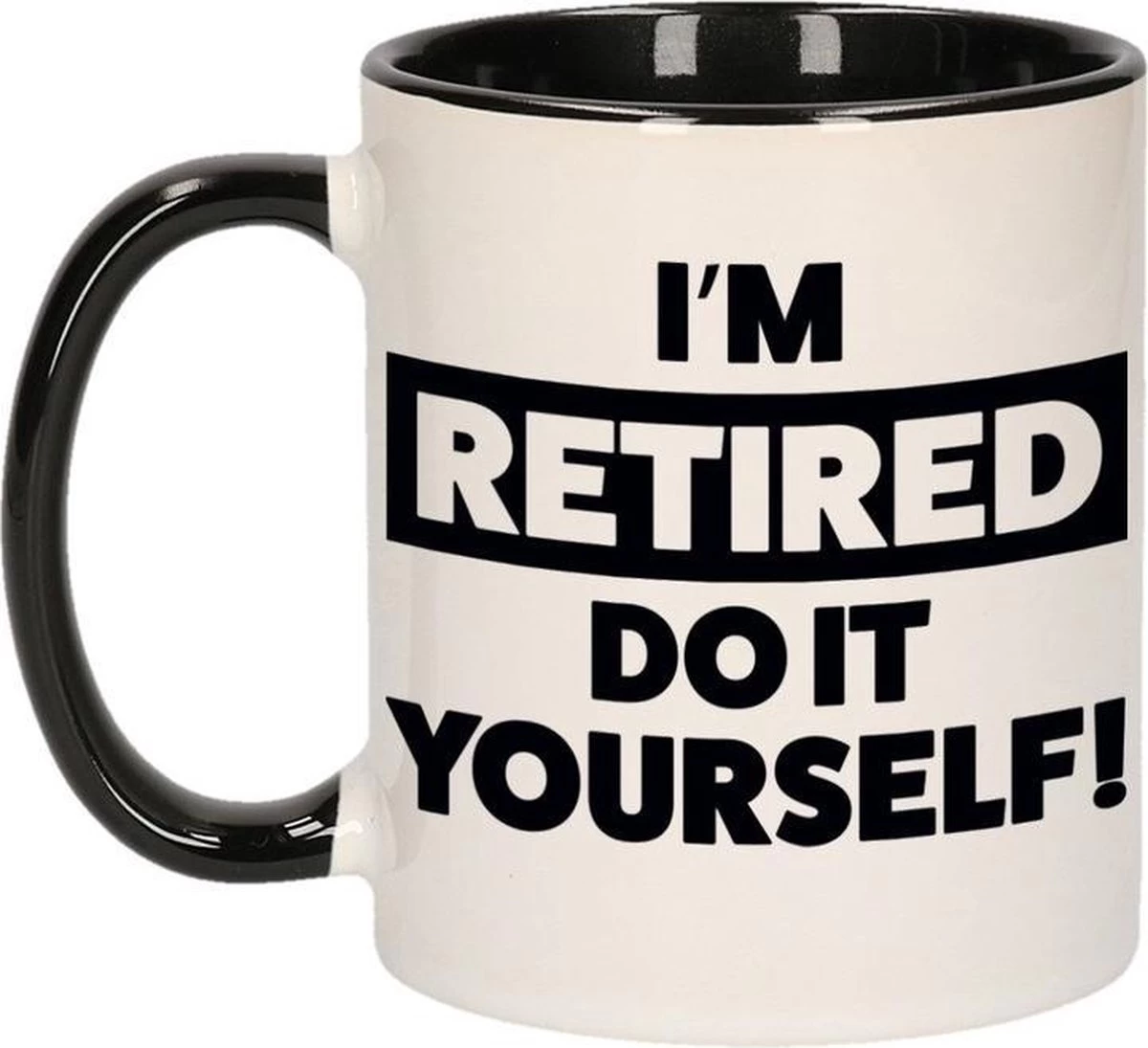 Pensioen kado mok / beker zwart, 300 ml. Op de mok staat: Im retired do it yourself. Deze zwarte pensioen beker heeft een zwarte binnenkant en een zwart oor, is magnetron- en vaatwasmachine bestendig en heeft een inhoud van 300 ml. Materiaal: keramiek. Hoogte: 9,5 cm. Doorsnede: 8,2 cm.