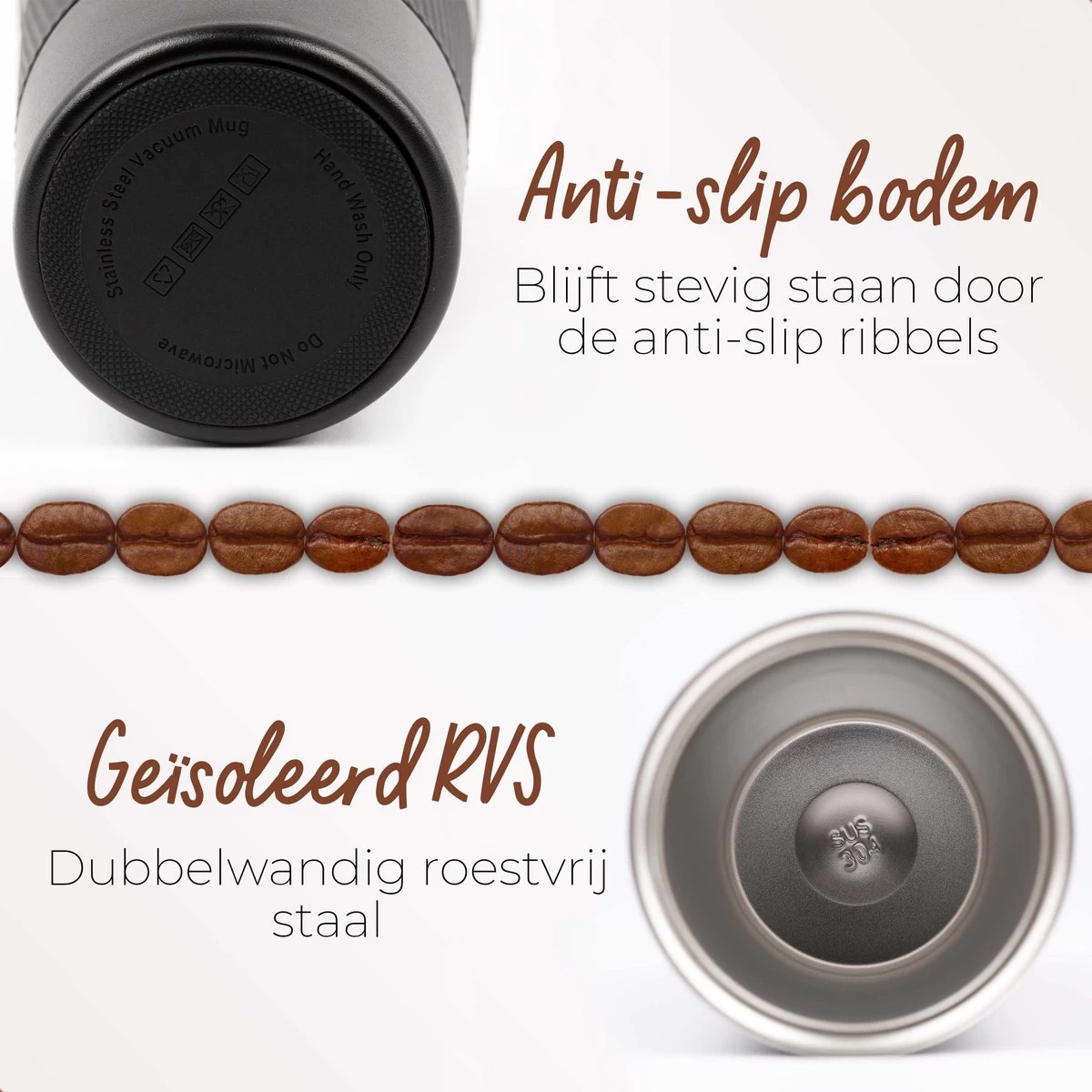 Er is niks vervelender dan koffie morsen over je kleding door een lekke koffiebeker. Daarom is onze koffiebeker 100% lekvrij met een afsluitbare en lekvrije deksel met schroefdraad. We hebben de beker voorzien van een antislip laag aan de onderkant, zo voorkom je bijvoorbeeld ook dat je koffie over je toetsenbord valt als je er per ongeluk tegen aan stoot.