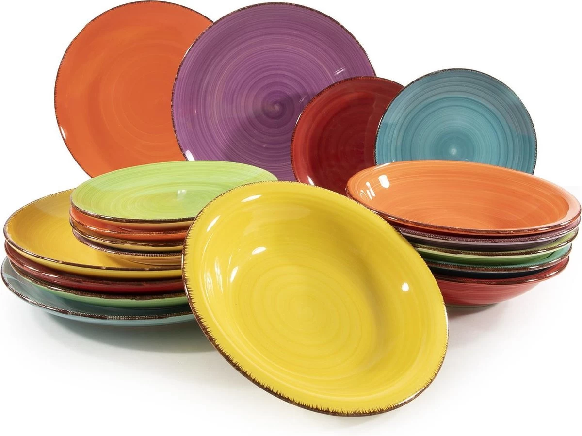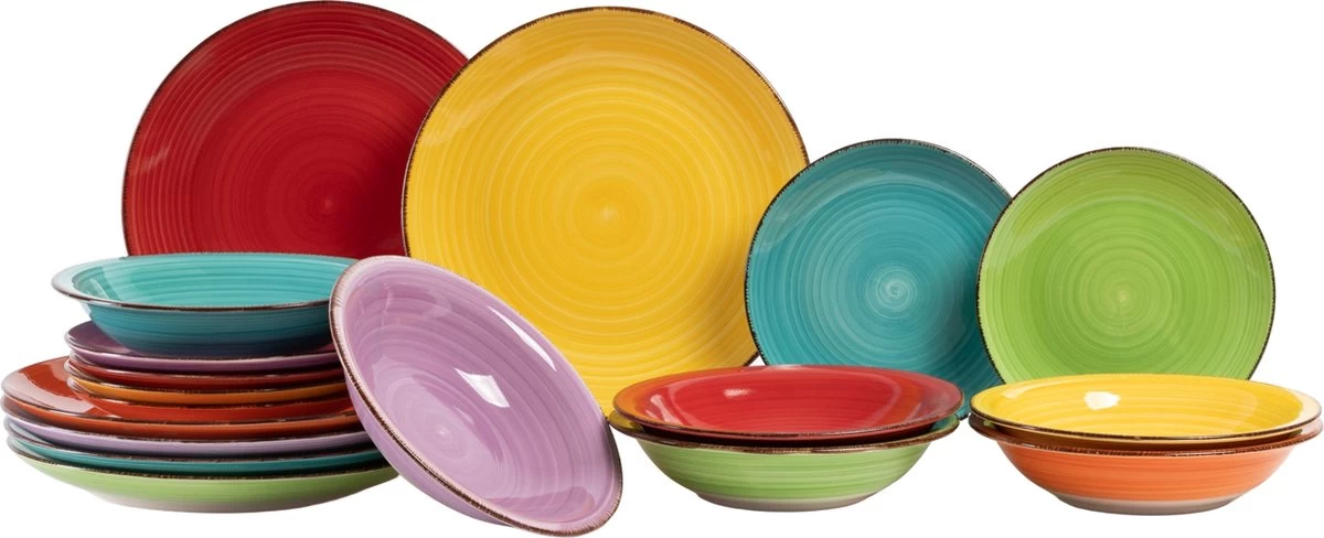 Studio Tavola Serviesset Sunny Summer 18-DeligWie van veel kleur en gezelligheid in huis houdt moet deze pastaborden van Studio Tavola aanschaffen. De gezellige kleuren vormen een bonte boel waarin je de lekkerste gerechten kan serveren. Let wel op: deze borden worden gemixt geleverd, er kan dus geen kleur gekozen worden. Combineer de borden met bijvoorbeeld de mokken, dinerborden of diepe borden uit de Sunny Summer collectie. De set bestaat uit: 6 ontbijtborden Ø 19 cm 6 soepborden Ø 20 cm 6 dinerborden Ø 27 cm